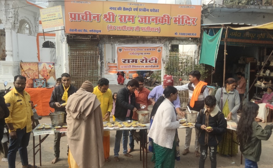 नर्मदापुरम / पौष पूर्णिमा के पावन अवसर पर विश्व हिंदू परिषद बजरंग दल द्वारा श्री राम रोटी प्रसादी वितरण का प्राचीन श्री राम जानकी मंदिर सेठानी घाट पर भक्ति, सेवा और श्रद्धा के साथ भव्य रूप से संपन्न हुआ। श्रद्धालुओं ने प्रसादी ग्रहण कर पुण्य लाभ अर्जित किया। सदस्यों ने बताया कि सेवा ही हमारा धर्म है और राम काज ही हमारा संकल्प है। इस सेवा कार्य में उपस्थित जिला संयोजक नितिन मेषकर, जिला उपाध्यक्ष पृथ्वीपाल सिंह ठाकुर, जिला सह संयोजक प्रदीप दायमा, बजरंग दल जिला गौरक्षा प्रमुख दिनेश किर, नगर उपाध्यक्ष प्रखर राज शर्मा, नगर सह मंत्री सुरेंद्र साहू, नगर सह संयोजक राहुल बड़कुर, महेंद्र मेषकर, ब्रज पालीवाल, बबली शर्मा, अजय पाराशर, इंदल रैकवार, मातृशक्ति से दुर्गा मालवीय एवं अन्य कार्यकर्तागण उपस्थित हुए।