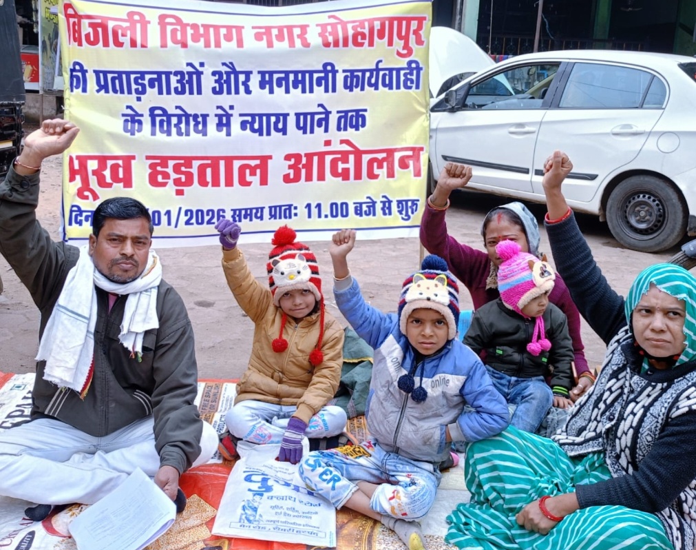 सोहागपुर / जब कोई परेशान हो जाता है तो वह उस परेशानी से निजात पाने के लिए कोई ना कोई कदम उठाता है। हम बात कर रहे है एक गरीब परिवार की जो कड़ाके की ठंड में सड़क पर परिवार सहित बैठा है। SDM कार्यालय के ठीक सामने भूख हड़ताल पर बैठे द्वारका प्रसाद कहार अपने साथ मासूम बच्चों को लेकर बैठे हैं—वे बच्चे, जिनकी जगह इस मौसम में रजाई के अंदर होनी चाहिए थी, न कि ठंडी ज़मीन पर। बिजली विभाग की तानाशाही और कथित मनमानी ने इंसानियत की सारी सीमाएं तोड़ दीं। जिस मीटर को खुद विभाग ने खराब मानकर बदला, उसी मीटर का ₹13,352 का बिल गरीब उपभोक्ता पर थोप दिया गया। विरोध करने और जांच की मांग करने की सज़ा यह मिली कि घर की बिजली काट दी गई। न सुनवाई, न जांच, न कोई जवाब—सिर्फ दबाव और धमकी।