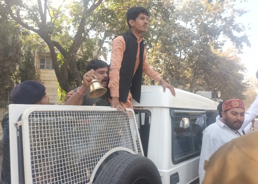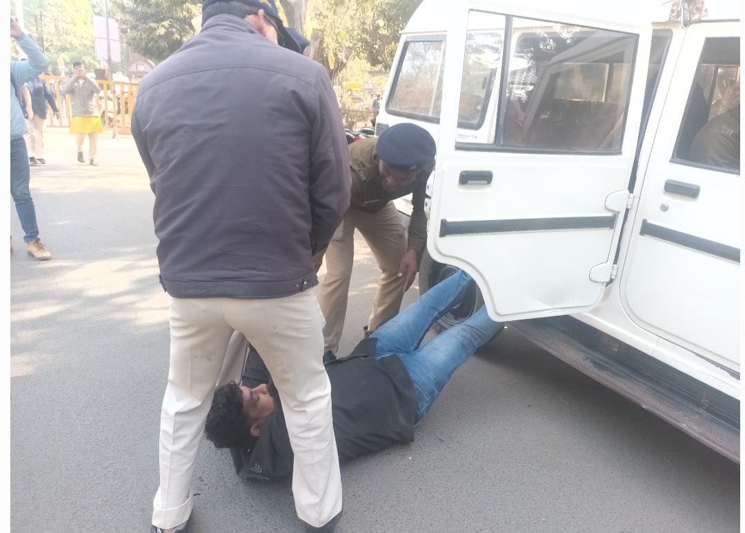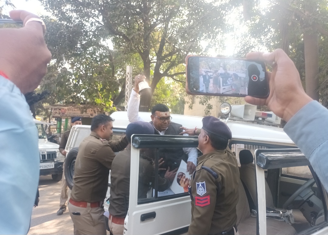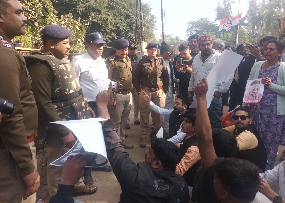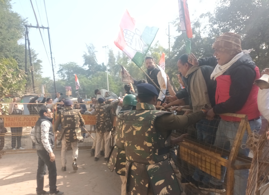 नर्मदापुरम / सोमवार को दोपहर 2:00 नेहरू पार्क के पास स्थित सांसद दर्शन सिंह चौधरी के निवास के सामने कांग्रेस कार्यकर्ताओ ने एकत्रित होकर मोर्चा खोला। कैलाश विजयवर्गीय के मीडिया कर्मी को दिए गए बयान ‘घंटा’ के विरोध में प्रदर्शन किया। बता दें कि नगरीय प्रशासन मंत्री कैलाश विजयवर्गीय ने दूषित पानी पीने से हुई मृत्यु के बाद बयान में मीडिया के सामने अशोभनीय भाषा घंटा का शब्द का प्रयोग किया था। प्रदर्शन के नियत समय के पहले ही पुलिस ने सांसद निवास के मुख्य द्वार के सामने वेरीकेट लगा दिए थे। कांग्रेसी हाथों में पोस्टर और कांग्रेस के झंडे और घंटा बजाते हुए सांसद निवास के मुख्य द्वार पर पहुंचे तो पुलिस से उनकी झड़प हुई, लेकिन पुलिस ने उन्हें वेरिकेट तोड़कर अंदर दाखिल नहीं होने दिया और कांग्रेसी मुख्य गेट के बाजू में दीवाल पर चढ़कर अंदर जाने लगे तो पुलिस ने वहां भी उन्हें अंदर नहीं जाने दिया। पुलिस ने हल्का बल प्रयोग कर उन्हें अंदर नहीं घुसने दिया। कांग्रेसियों को पड़कर थाने ले गई।
