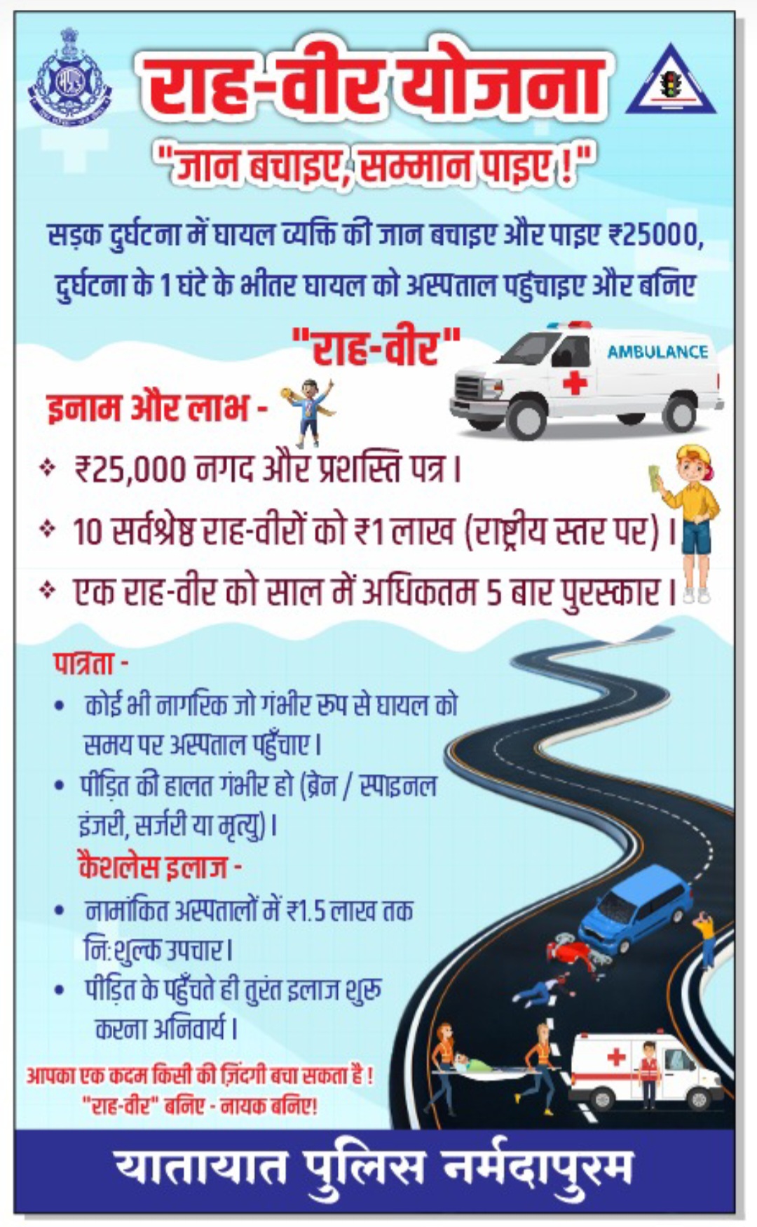 नर्मदापुरम / सड़क दुर्घटना मे घायलों की मदद करें और कानूनी दिक्कत से सुरक्षा के साथ प्रशासन से सम्मान भी प्राप्त करें यह अपील नर्मदापुरम पुलिस ने की है कि “राहवीर योजना ” के अंतर्गत शासन द्वारा इस प्रकार का प्रावधान किया गया है। मध्य प्रदेश की ‘राहवीर योजना’ (Rahveer Yojana) सड़क दुर्घटना में घायल व्यक्ति को ‘गोल्डन आवर’ (दुर्घटना के 1 घंटे के भीतर) में अस्पताल पहुँचाने वाले मददगार नागरिक (राहवीर) को ₹25,000 का इनाम देती है, जिसका उद्देश्य जान बचाने के लिए लोगों को प्रोत्साहित करना है, जैसा कि मध्य प्रदेश सरकार द्वारा अनुमोदित और लागू किया गया है और इस योजना में राहवीरों को कानूनी सुरक्षा और प्रशंसा भी मिलती है।