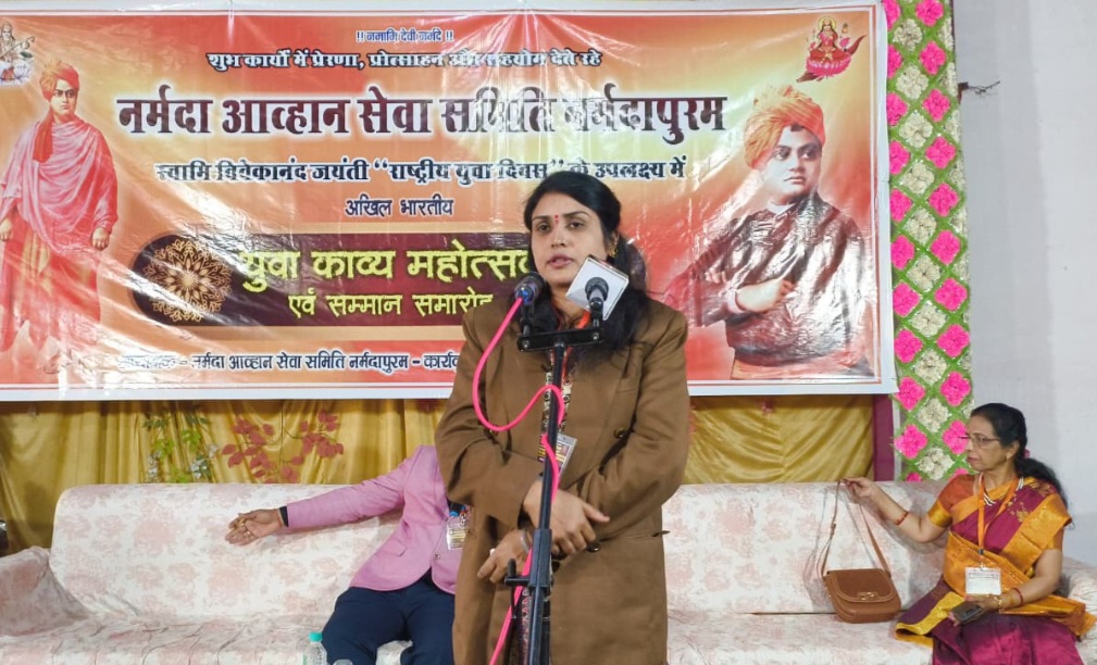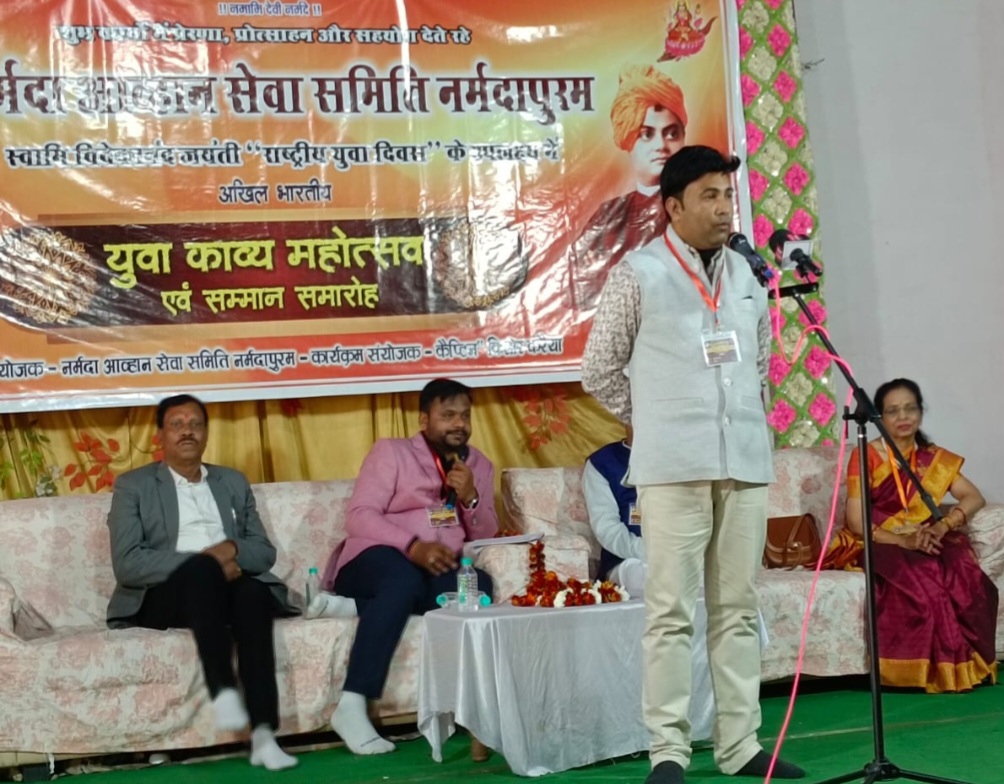 नर्मदापुरम / स्वामी विवेकानंद जयंती के अवसर पर नर्मदा आव्हान सेवा समिति नर्मदापुरम व्दारा अखिल भारतीय काव्य महोत्सव, सम्मान समारोह (कवि सम्मेलन) में मुख्य अतिथि के रूप में पंकज चौरे अध्यक्ष नगर पालिका परिषद इटारसी ,विशिष्ट अतिथियों मे प्रमोद पगारे , वरिष्ठ साहित्यक तथा प्रदेश के वरिष्ठ कवि बी.के. पटैल की अध्यक्षता में अनूठा आयोजन अखिल भारतीय कवि सम्मेलन का आयोजन सम्पन्न हुआ।कवि सम्मेलन देर शाम तक जारी रहा। देश के विभिन्न अंचलों से आए 45 युवा कवियों ने अपनी कविता, गीत, गजल, ओज, हास्य, व्यंग्य की रचनाओं से भाव विभोर कर दिया।मुख्यातिथि पंकज चौरे ने मुक्त कंठ से कार्यक्रम कि सराहना करते हुए आयोजक केप्टिन करैया को बधाई देते हुए कहां कि ऐसे आयोजन होते रहना चाहिए। विशिष्ट अतिथि प्रमोद पगारे ने कहा कि युवाओं के प्रेरणा श्रोता विवेकानंद जयंती पर शुभकामनाएं देते हुऐ कहा की युवा कवियों को प्रेरित करते हुए कहां की आप सभी युवा कवियों को देशहित , समाजहित एवं जनजाग्रति के लिए कविताएं लिखना चाहिए। अध्यक्षता करते हुऐ बी.के. पटैल ने कहा कि नर्मदा आव्हान समिति के युवा महोत्सव में आये प्रतिभावान कवि/कवियित्रियों के प्रति में आश्वस्त हूँ कि आप राष्ट्र और समाज के लोक कल्याण को ध्यान में रखते हुए उत्कृष्ट काव्य सृजन करके हिन्दी साहित्य को समृद्ध करेंगे। उन्होने कहाँ देश मे एक मात्र नर्मदा आव्हान सेवा समिति ही ऐसी संस्था है जो निशुल्क कवि समागम करती है। स्वागत भाषण कैप्टिन करैया ने दिया। अतिथि एवं कवियों का स्वागत केप्टिन करैया, विनोद सनोडिया, पवन प्रबल, अश्विन कुमार, एस.आर.धोटे, सावन कुमार नवीन हरियले, विनीता मालवीय ने फूल-मालाओं से किया। मां सरस्वती की पूजा अर्चना एवं स्वामी विवेकानंद के चित्र पर फूलमालाओं से कार्यक्रम प्रारंभ हुआ। सरस्वती वंदना पिपरिया से आई रोशनी रावत की प्रस्तुति से सम्मेलन का प्रारंभ हुआ। कवि सम्मेलन दो सत्रों मे किया गया। प्रथम सत्र का कुशल संचालन पवन प्रबल ने द्वितीय सत्र का सफल संचालन सुनील केहरी ने किया। अतिथियों की उपस्थिति मे नर्मदा आव्हान सेवा समिति के पदाधिकारियों ने युवा कवियों को स्मृति चिन्ह एंव युवा शब्द साधक प्रमाण पत्र से सम्मानित किया। चेतन जोशी (कांटाफोड़) ने “नील के कंठ हो या अमरकंठ हो”