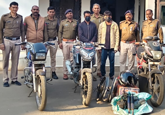 बरामद मशरूका का विवरण 1. अपराध क्र. 25/2026 में चोरी गई मोटर सायकल क्रमांक MP05ZB1711 TVS राईडर किमती 70,000 रूपये, 2. अपराध क्रे. 21/2026 में चोरी गई, मोटर सायकल क्रमांक MP05MV5738 पेशन प्रो कीमत 48,000 रूपये, 3. अपराध क्रं. 27/2026 में चोरी गई मोटर सायकल क्रमांक MP05MU3602 होंडा साईन के पहिये व इंजन कीमत 40,000 रूपये, 4. अपराध कं. 06/2026 में चोरी गई मोटर सायकल क्रमांक MP05AD7463 हीरो होंडा स्पलेंडर किमती 25,000 रूपये जप्त मशरूका 04 मोटर सायकल कुल किमती 01 लाख 83 हजार रूपये नाम आरोपीगण 1- मोहम्मद उर्फ राजा पिता नियाज मोहम्मद उम्र 23 निवासी गाडरी मोहल्ला सिवनी मालवा जिला नर्मदापुरम 2- जुनैद पिता सईद खान 35 साल निवासी गाडरी मोहल्ला सिवनी मालवा जिला नर्मदापुरम । इस कार्यवाही में निरीक्षक गौरव सिंह बुंदेला, सउनि शिवनाथ यादव, उनि अरविन्द बेले, सउनि रामराव उईके सउनि रामस्वरूप बिल्लौरे, प्रधान आरक्षक संदीप अजनेरिया, आरक्षक शाकिर, आरक्षक अनिल पाल, आरक्षक राकेश मंडलोई, आरक्षक संदीप दुबले, आरक्षक चालक राजेश पंवार थाना इटारसी की महत्वपूर्ण भूमिका रही है।