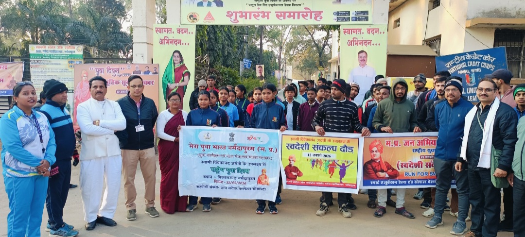 नर्मदापुरम / सोमवार को स्वामी विवेकानंद की 164 वीं वर्षगांठ पर नर्मदा महाविद्यालय से स्वदेशी संकल्प यात्रा निकाली गई। जिसमें कॉलेज विद्यार्थियों ने हिस्सा लिया और स्वदेशी के जयघोष लगाया ।स्वदेशी के नारों के साथ यह दौड़ प्रारंभ हुई और नगर के प्रमुख मार्गो से होते हुए नर्मदा महाविद्यालय पर ही समाप्त हुआ। इस अवसर पर स्वदेशी जागरण मंच के जिला सहसंयोजक संजय शर्मा ने स्वदेशी का महत्व छात्रों को बताया। स्वदेशी का संकल्प दिलाया। इस अवसर पर इंद्र मोहन दुबे , साहिल तिलोनिया एवं अन्य कार्यकर्ता उपस्थित रहे। नर्मदा महाविद्यालय के प्राध्यापक मानकर ने भी मार्गदर्शन किया।