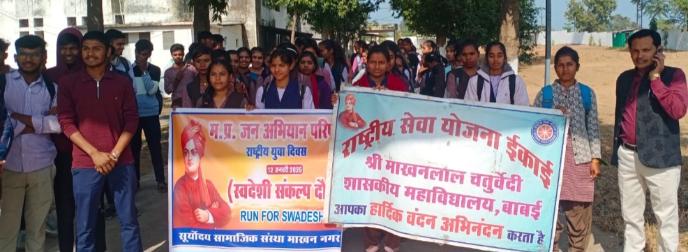 माखननगर / स्वामी विवेकानंद जी 163 वी जन्मजयंती के पावन अवसर पर मध्यप्रदेश जन अभियान परिषद माखन नगर द्वारा “युवा दिवस” मनाया गया, जिसमे स्वदेशी संकल्प दौड़ का आयोजन किया गया। इस अवसर पर कार्यक्रम के मुख्य अतिथि महाविद्यालय प्राचार्य श्रीमति नीता चौबे, नावँकुर संस्था संचालक मनीष चतुर्वेदी , एडवोकेट दीप सिंह यादव, मेंटर्स हर्ष तिवारी उपस्थित थे। उन्होंने स्वामी विवेकानंद जी के चित्र पर माल्यार्पण कर कार्यक्रम का शुभारंभ किया तथा हर्ष तिवारी ने मध्यप्रदेश जन अभियान परिषद के द्वारा स्वदेशी स्वामी विवेकानंद के प्रेरक मंत्र “उठो, जागो और लक्ष्य प्राप्ति तक रुको नहीं” को आत्मसात करने का आग्रह किया। दीप सिंह यादव ने कहा स्वदेशी वस्तुओं का अधिक से अधिक उपयोग की अपील की गई। मनीष चतुर्वेदी ने कहा कि मध्यप्रदेश जन अभियान परिषद द्वारा स्वामी विवेकानंद जी की जयंती 12 जनवरी से गणतंत्र दिवस 26 जनवरी 2026 तक “ग्रामोदय से अभ्युदय मध्यप्रदेश अभियान” के अंतर्गत ग्राम विकास पखवाड़ा आयोजित किया जा रहा है। अभियान के अंतर्गत ग्राम स्तर पर उत्सव, चौपाल, रैली, सामूहिक श्रमदान एवं परिवार संपर्क जैसी गतिविधियों का आयोजन किया जाएगा। इनमें पर्यावरण संरक्षण, जल संरक्षण, स्वदेशी एवं स्वावलंबन, जैविक कृषि एवं गौ-संरक्षण, शिक्षा-संपन्न एवं संस्कारवान समाज का निर्माण, सामाजिक समरसता का संवर्धन, नागरिक सेवा भाव का विकास तथा स्वस्थ एवं नशामुक्त समाज जैसे महत्वपूर्ण विषयों को सम्मिलित किया गया है। कार्यक्रम में महाविद्यालय छात्र-छात्राएं, उपस्थित थे। कार्यक्रम का संचालन हर्ष तिवारी द्वारा किया, कार्यक्रम में स्वदेशी की शपथ दिलाई गई एवं जागरूकता रैली निकाली गई।
