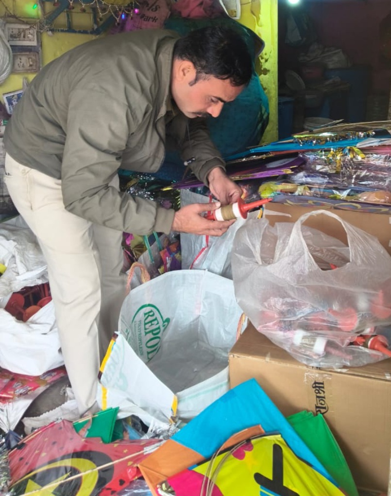 नर्मदापुरम / पुलिस अधीक्षक साई कृष्णा एस थोटा के मार्गदर्शन, अतिरिक्त पुलिस अधीक्षक अभिषेक राजन एवं अनुविभागीय अधिकारी (पुलिस) जितेंद्र पाठक के निर्देशन में थाना कोतवाली पुलिस द्वारा थाना कोतवाली नर्मदापुरम क्षेत्रांतर्गत स्थित पतंग की दुकानों को चेक कर चाइनीज माँझे के विरुद्ध कार्यवाही करने मे सफलता प्राप्त की है। ज्ञात हो की मध्य प्रदेश सरकार द्वारा चाइनीज़ माँझे से होने वाली दुर्घटनाओ की रोकथाम हेतु चाइनीज माँझे के विरुद्ध अभियान चलाया जा रहा है। अभियान के दौरान थाना कोतवाली नर्मदापुरम द्वारा लागतर थाना कोतवाली नर्मदापुरम क्षेत्रांतर्गत पतंग-माँझे की दुकानों को चेक किया जा रहा है एवं आम जनता को सोशल मीडिया व व्यक्तिगत रूप से चाइनीज़ माँझे का उपयोग नहीं किए जाने के संबंध मे जागरूक किया जा रहा है। आज दिनांक 14/01/2026 को पतंग-माँझे की दुकानों को चेक करते हुये पुलिस टीम द्वारा रॉयल मेडिकल* के सामने नर्मदापुरम मे देवेंद्र पिता मुन्नालाल कहार उम्र 24 वर्ष नि. पिलिखंती नर्मदापुरम की दुकान को चेक किया गया। चेकिंग के दौरान उक्त दुकान में 01 गुच्छा चाइनीज माँझा मिलने से देवेंद्र पिता मुन्नालाल काहर उम्र 24 वर्ष नि. पीली खंती नर्मदापुरम के विरुद्ध अपराध धारा 223(बी) भारतीय न्याय संहिता का दर्ज कर विवेचना में लिया गया है।