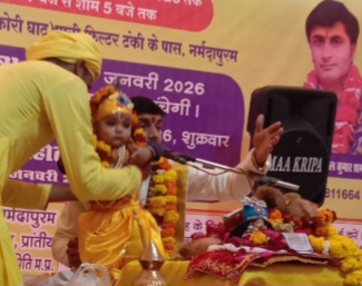 नर्मदापुरम / श्री गौड़ मालवीय बढ़ई समाज एवं सहयोगियों द्वारा श्रीमद् भागवत कथा का आयोजन पर्यटन घाट में किया जा रहा है। कथा के चतुर्थ दिवस पर भक्तगणों की भव्य उपस्थिति में भगवान श्री राम के जन्मोत्सव एवं भगवान श्री कृष्ण जन्मोत्सव के आयोजन की भावपूर्ण झांकी की प्रस्तुति के साथ हुआ । झांकी की प्रस्तुति देखकर श्रोतागण मंत्र मुक्त होकर झूम कर नाचने गाने लगे। यह भक्ति भाव ईश्वर प्रेम और स्नेह का संदेश आज नर्मदा तट से समाज के कल्याण के लिए समाज की एकजुटता के लिए कथा के माध्यम से हुआ है। आयोजन कर्ता ने धर्मप्रेमियों से निवेदन किया कि वे संगीत में श्रीमद्भागवत कथा का आनंद एवं धर्म लाभ प्राप्त करने के लिए दोपहर 1:00 बजे से दोपहर 5:00 बजे होने वाली कथा में सम्मिलित होकर पुण्यलाभ अर्जित करें। आज वुधवार की कथा में गोवर्धन पर्वत की पूजन एवं भगवान को छप्पन भोग का भोग लगाया जावेगा।