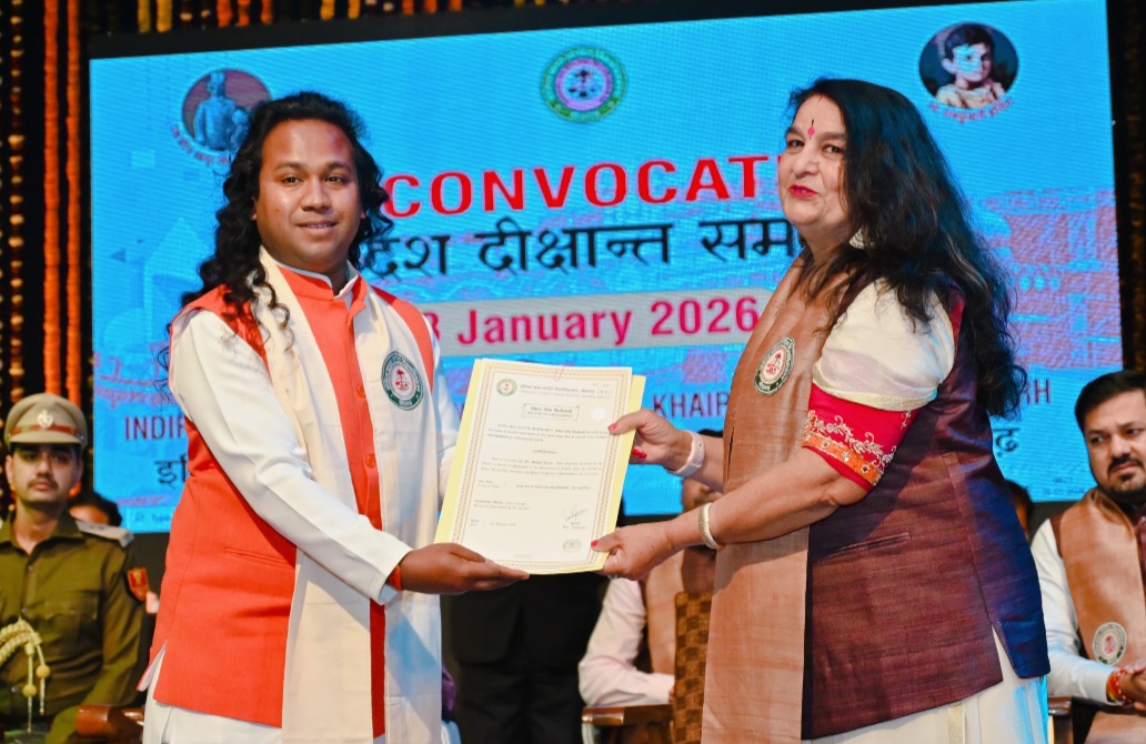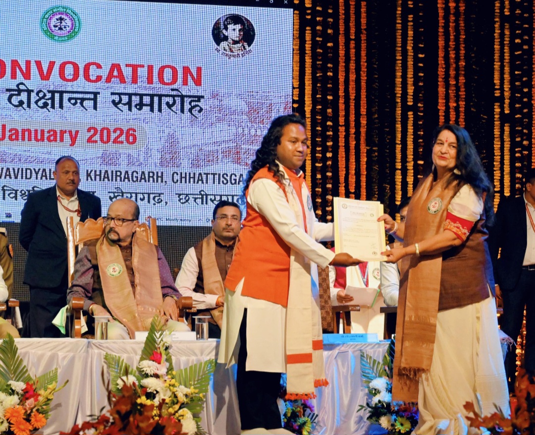 इटारसी / वुधवार दिनांक 28/01/2026 देश की प्रतिष्ठित कला शिक्षण संस्था इंदिरा कला संगीत विश्वविद्यालय खैरागढ़ में बुधवार को 17वां दीक्षांत समारोह गरिमामय एवं उल्लासपूर्ण वातावरण में संपन्न हुआ। समारोह में छत्तीसगढ़ के राज्यपाल रामेन डेका, छत्तीसगढ़ शासन के मंत्री टंकराम वर्मा, विधायक अनुज शर्मा एवं कुलपति प्रो. डॉ. लवली शर्मा ने विद्यार्थियों को उपाधी एवं स्वर्ण पदक प्रदान कर सम्मानित किया। जिसमें 5 शोधार्थियों को डी.लीट, 64 शोधार्थियों को पीएचडी और 232 विद्यार्थियों को स्वर्ण पदक एवं 4 विद्यार्थियों को रजत पदक प्रदान किए गए। दीक्षांत समारोह के दौरान इटारसी के युवा कलाकार एवं गोल्ड मेडलिस्ट डॉ. दीपक वर्मा को कथक विद्या में डॉक्टरेट की उपाधि प्रदान की गई। उल्लेखनीय है कि डॉ. वर्मा को वर्ष 2015 में इंदिरा कला संगीत विश्वविद्यालय, खैरागढ़ द्वारा बी.ए. कथक में प्रावीण्य स्थान प्राप्त करने पर स्वर्ण पदक से भी सम्मानित किया गया था। डॉ. दीपक वर्मा वर्तमान में दूरदर्शन केंद्र, भोपाल के ग्रेडेड कलाकार हैं तथा नरसिंहगढ़ संगीत महाविद्यालय में सहायक प्राध्यापक (कथक) के पद पर कार्यरत हैं। समारोह में विश्वविद्यालय के पदाधिकारी, शिक्षाविद्, जनप्रतिनिधि एवं बड़ी संख्या में विद्यार्थी उपस्थित रहे।
