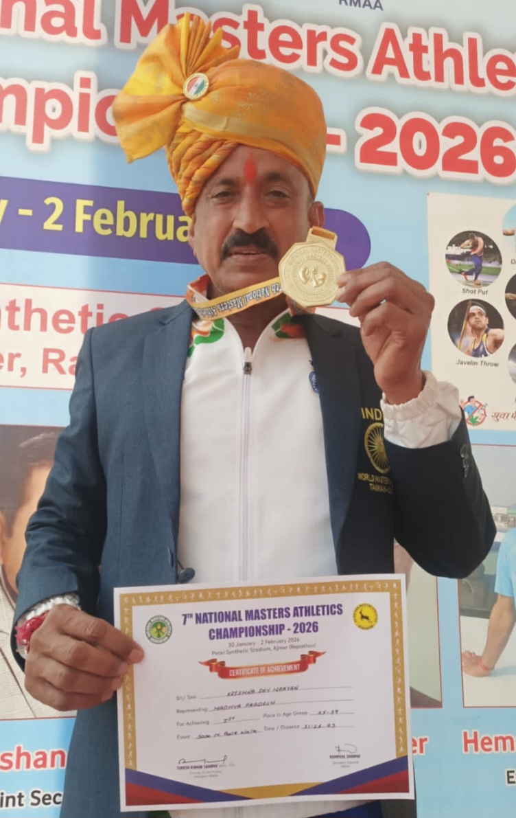 नर्मदापुरम / राजस्थान के अजमेर में आयोजित 07वीं नेशनल मास्टर एथलेटिक्स चैंपियनशिप 2026 में मध्य प्रदेश के दिग्गज एथलीट और ‘मां रेवा सेवा समिति’ के सेवक के.एन. त्रिपाठी ने अपनी रफ्तार से इतिहास रच दिया है। 30 जनवरी से 2 फरवरी तक चली इस राष्ट्रीय प्रतियोगिता में त्रिपाठी ने 5 किलोमीटर पैदल चाल (Race Walk) स्पर्धा में स्वर्ण पदक के साथ नर्मदापुरम का नाम पूरे देश में गौरवान्वित किया है।