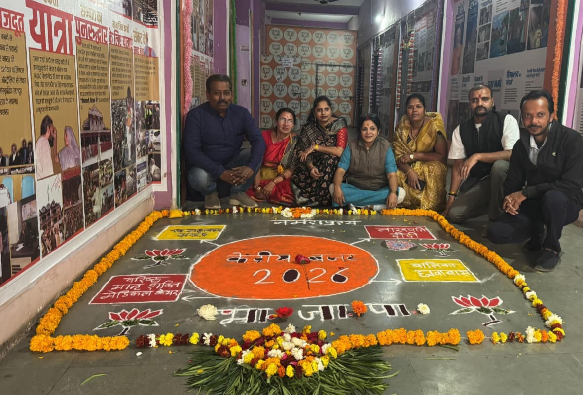 नर्मदापुरम / केंद्रीय बजट 2026-27 नारी सशक्तिकरण, समावेशी विकास और विकसित भारत के संकल्प को नई मजबूती प्रदान करता है। भाजपा महिला मोर्चा, नर्मदापुरम इस दूरदर्शी पहल का स्वागत करते हुए सोमवार को जिला कार्यालय में रंगोली के माध्यम से देश के प्रधानमंत्री नरेन्द्र मोदी एवं केंद्रीय वित्त मंत्री श्रीमति निर्मला सीतारमण को धन्यवाद दिया। इस दौरान जिला उपाध्यक्ष कार्यक्रम प्रभारी लोकेश तिवारी, कार्यालय मंत्री प्रशांत दीक्षित, सह कार्यालय मंत्री वंदना दुबे, मीडिया प्रभारी अमित महाला, सोशल मीडिया जिला संयोजक गजेन्द्र चौहान, सह संयोजक राहुल ठाकुर, महिला मोर्चा मंडल अध्यक्ष चंचल राजपूत, मंडल उपाध्यक्ष कविता राजपूत, सुचित्रा यादव सहित कार्यकर्ता उपस्थित रहे।