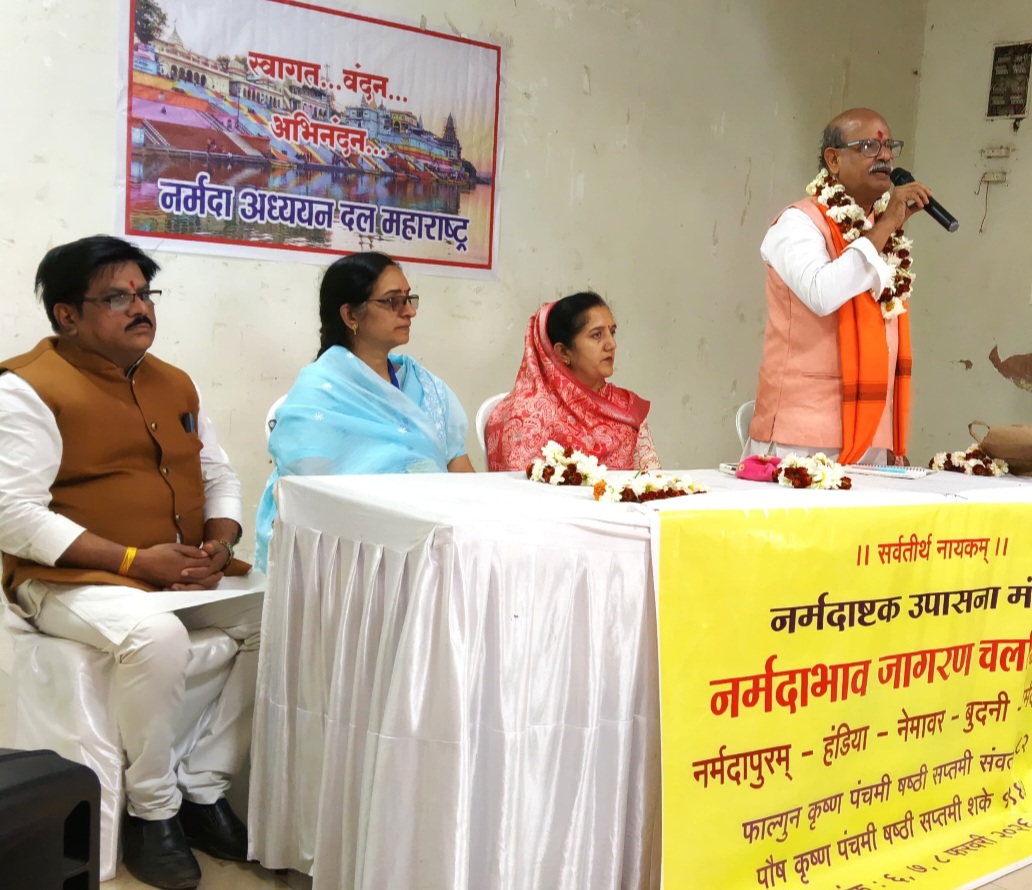 नर्मदापुरम / नर्मदाष्टक उपासना मंडल समिति का नर्मदा अध्ययन दल शुक्रवार को सेठानी घाट स्थित तिलक भवन से नर्मदा यात्रा पर रवाना हुआ। यह दल अखिल भारतीय विद्यार्थी परिषद नर्मदापुर के संगठन मंत्री रहे किशोर पौनीकर के नेतृत्व में महाराष्ट्र से आया है। जिसमें 30 से अधिक नर्मदा यात्री शामिल है। शुक्रवार सुबह सभी अध्ययन दल के सदस्यों ने मां नर्मदा का पूजन किया। सामूहिक नर्मदा अष्टक करने के बाद नर्मदापुरम से सभी ने अपनी यात्रा की जो कि डोंगरवाडा, खोकसर, आंवलीघाट, बाबरी घाट, चांदवडकुटी, छिपानेर, चिचोड बजरंग कुटी, लछोरा, हरदा, हंडिया, नेमावर, सलकनपूर, बुदनी से होकर वापस नर्मदापुरम पहुंचेगी। तिलक भवन में सभी अध्ययन दल सदस्यों का स्वागत सम्मान कार्यक्रम हुआ। इस दौरान नपाध्यक्ष नीतू यादव, जिला सहकारी बैंक के पूर्व अध्यक्ष भरत सिंह राजपूत, शशांक हर्णे, मीरा ताई ने अध्ययन दल के सदस्यों के समक्ष अपनी बात रखी। नर्मदा अध्ययन दल संयोजक किशोर पौनीकर ने इस यात्रा के उद्देश्य व नर्मदा संरक्षण कार्यक्रम व संवाद कार्यक्रम की जानकारी दी। श्री पौनीकर ने कहा कि इस यात्रा का उद्देश्य नर्मदाभक्ती के माध्यम से सांस्कृतिक, सामाजिक व पर्यावरणीय कार्य और नर्मदा किनारे बसे लोगों से संवाद करना है। कार्यक्रम के दौरान किशोर पौनीकर द्वारा लिखी गई नदीपुरक जीवन पद्धति पुस्तक का विमोचन सभी अतिथियों द्वारा किया गया। कार्यक्रम का संचालन मनीष परदेशी ने किया एवं सभी का आभार विकास नारोलिया द्वारा व्यक्त किया गया। कार्यक्रम के अंत में नर्मदा भक्त उमाशंकर चौबे और ऋषिकांत पटवा का सम्मान किया गया। इस अवसर पर विवेक गौर, अजय चिंटू शर्मा, नंदकिशोर यादव, दीपक हेमनानी, रूपेश राजपूत, सुंदरम अग्रवाल, श्रीराम सगर सहित अन्य नगर के नर्मदाभक्तों ने नर्मदा अध्ययन दल के सदस्यों का स्वागत कर रवाना किया।