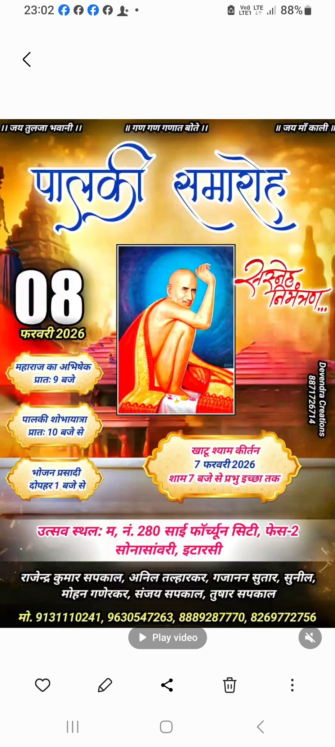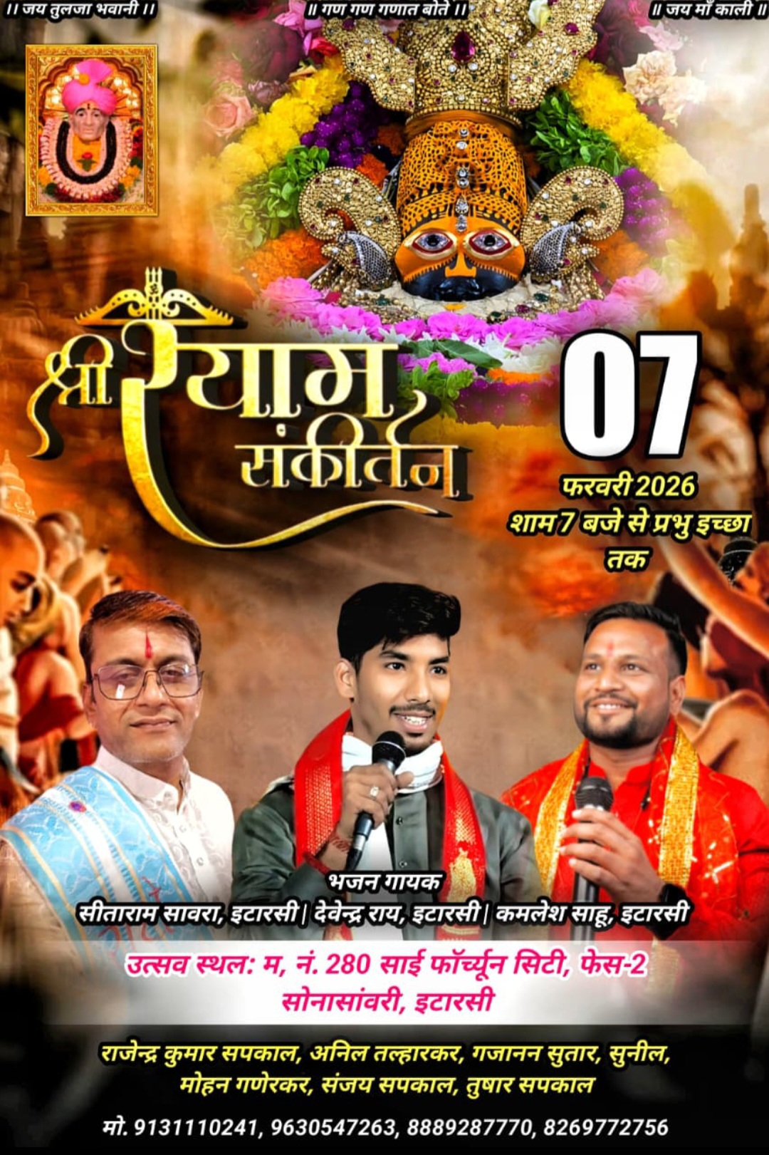 इटारसी / सोनासांवरी क्षेत्र स्थित साईं फॉर्च्यून सिटी, फेस-2 में *प्रति वर्ष की परंपरा के अनुसार इस वर्ष भी श्री गजानन महाराज के प्राकट्य दिवस के अवसर पर भव्य पालकी शोभायात्रा एवं धार्मिक आयोजन* किया जा रहा है। आयोजन को लेकर श्रद्धालुओं में उत्साह का माहौल बना हुआ है। कार्यक्रम के अनुसार रविवार सुबह 9 बजे श्री गजानन महाराज का अभिषेक, इसके पश्चात सुबह 11 बजे भव्य पालकी शोभायात्रा कॉलोनी भ्रमण पर निकलेगी।वहीं दोपहर 2 बजे श्रद्धालुओं के लिए विशाल भंडारे (भोजन प्रसादी) का आयोजन किया जाएगा। इसके अतिरिक्त धार्मिक वातावरण को और भक्तिमय बनाने के लिए एक दिन पूर्व 7 फरवरी शनिवार को शाम 8 बजे से प्रभु इच्छा तक खाटू श्याम कीर्तन का आयोजन भी किया जाएगा। इस धार्मिक आयोजन के आयोजक राजेन्द्र कुमार सपकाल, अनिल तल्हारकर, गजानन सुतार, सुनील मोहन गणेरकर, संजय सपकाल एवं पत्रकार तुषार सपकाल हैं। आयोजकों ने नगर एवं आसपास के क्षेत्र के श्रद्धालुओं से अधिक से अधिक संख्या में उपस्थित होकर धर्म लाभ लेने की अपील की है।