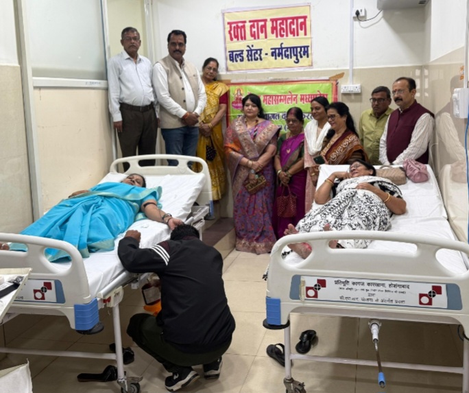 नर्मदापुरम् / वैश्य महासम्मेलन मध्य प्रदेश युवा इकाई एवँ महिला इकाई द्वारा रविवार को जिला चिकित्सालय स्थित रेड क्रॉस भवन में रक्तदान शिविर का आयोजन किया गया। यह आयोजन संस्था के संस्थापक अध्यक्ष स्व. नारायण प्रसाद गुप्ता ‘नानाजी’ की पुण्यतिथि के स्मृति में किया गया। शिविर में समाज के युवाओं और पदाधिकारियों ने उत्साहपूर्वक रक्तदान कर मानवता का संदेश दिया। इस अवसर पर सम्भागीय अध्यक्ष नीरजा फौजदार एवं जिला अध्यक्ष (युवा) गौरव सेठ ने कहा कि रक्तदान से बड़ा कोई दान नहीं है, हमारी एक पहल किसी का जीवन बचा सकती है। रक्तदान के पश्चात उपस्थित अतिथियों द्वारा जिला अस्पताल में भर्ती मरीजों को फल वितरित कर उनके शीघ्र स्वास्थ्य लाभ की कामना की गई। इस कार्यक्रम में मुख्य रूप से सम्भागीय उपाध्यक्ष भारती अग्रवाल, जिला अध्यक्ष कुकू भाई (विपिन जैन), पूर्व जिला अध्यक्ष उषा अग्रवाल, नगर अध्यक्ष शारदा जैन, जयंती जैन, अनीता अरुण जैन, उषा गुप्ता, नर्मदा प्रसाद साहू एवं कोमल साहू सहित बड़ी संख्या में सामाजिक कार्यकर्ता उपस्थित रहे।