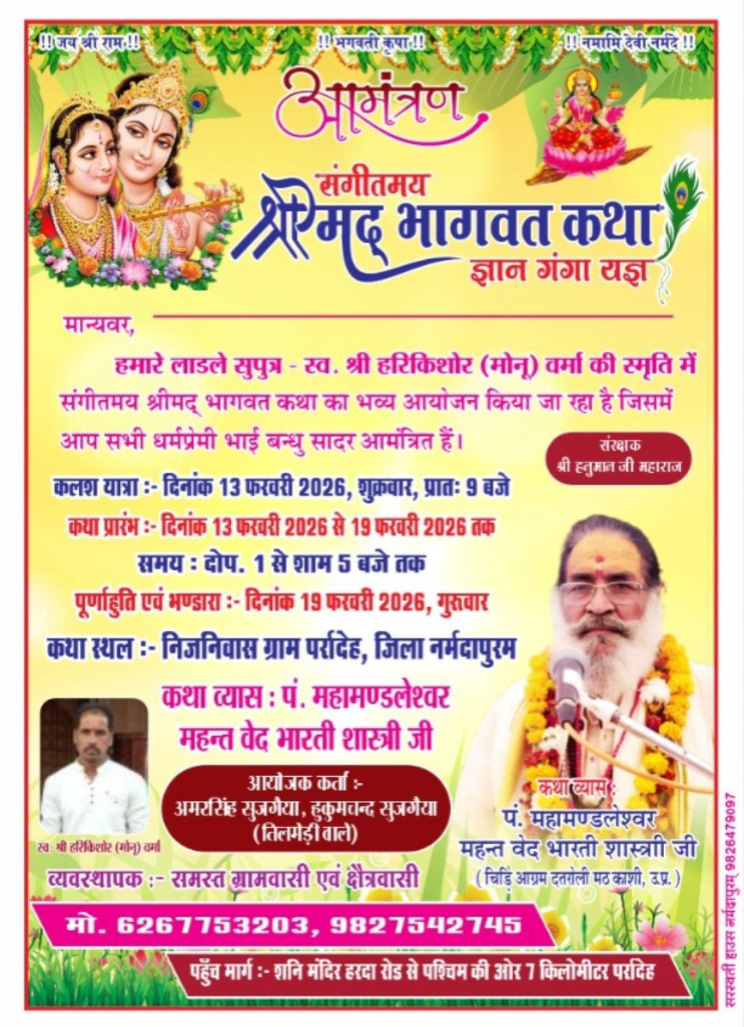 नर्मदापुरम / स्व. श्री हरिकिशोर (मोनू) वर्मा की स्मृति में संगीतमय श्रीमद् भागवत कथा का भव्य आयोजन किया जा रहा है। जिसमें सभी धर्मप्रेमियों को कथा का श्रवण करने आमंत्रित किया हैं।