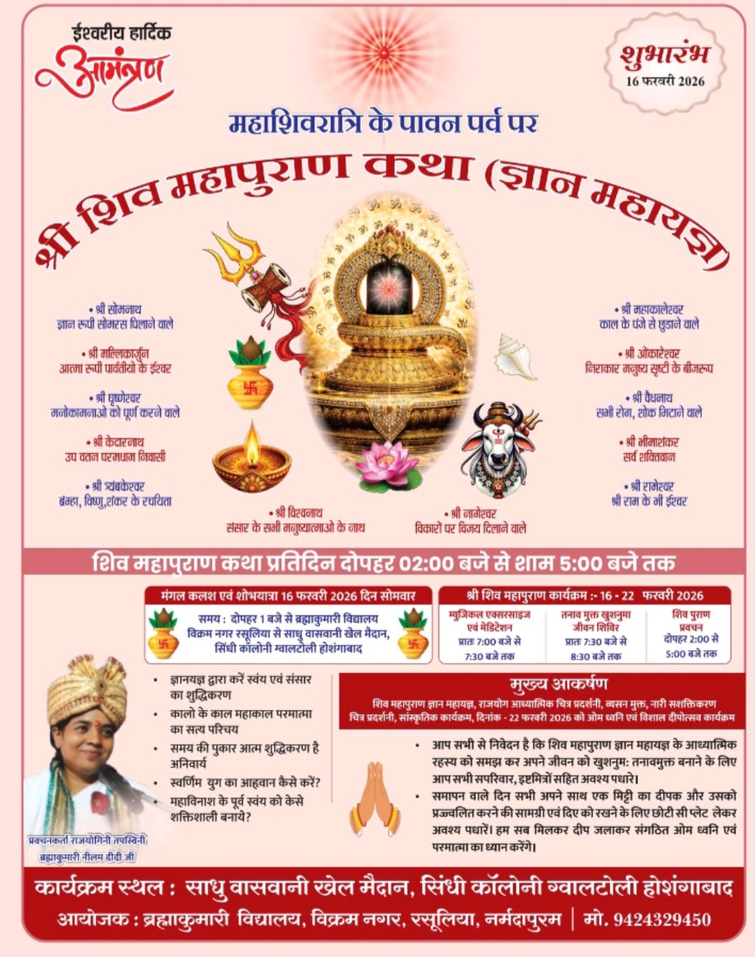 नर्मदापुरम / महाशिवरात्रि का त्योहार हम सबके लिए एक दिव्य और अलौकिक पर्व है जो हमें परमात्मा शिव से जुड़ना सिखाता है, क्योंकि भगवान सर्वशक्तिमान है सर्वश्रेष्ठ है। शिवरात्रि पर हम सभी शिव बाबा का अभिषेक करते हैं धतूरा चढ़ाते हैं बैर चढ़ाते हैं बेलपत्र चढ़ाते हैं और भगवान शिव की आराधना करते हैं। भगवान ने कहा बच्चे विकारों रूपी कांटों का त्याग करो और अच्छे गुणों को अपने अंदर धारण करो, बेर भावनाओं को छोड़ो शुभभावनाओं को धारण करो तो जीवन खुशियों से भरेगा” यही संदेश भगवान हमें देते हैं। प्रजापिता ब्रह्माकुमारी ईश्वरी विश्वविद्यालय जो आध्यात्मिक संस्थान है जो प्रतिवर्ष शिवरात्रि पर विशाल कार्यक्रमों का आयोजन करते रहा है। इस बार महाशिवरात्रि के पावन पर्व पर “श्री शिव महापुराण कथा ज्ञान महायज्ञ” का आयोजन किया गया है। यह कार्यक्रम 16 फरवरी से 22 फरवरी तक खेल मैदान सिंधी कॉलोनी ग्वालटोली में रहेगा। 16 फरवरी दोपहर 12:00 बजे विक्रम नगर रसूलिया से कलश यात्रा निकाली जाएगी। जो ग्वालटोली खेल मैदान तक पहुंचेगी एवं उद्घाटन होकर श्री महाशिवपुराण का शुभारंभ होगा। प्रजापिता ब्रह्माकुमारी ईश्वरी विश्वविद्यालय द्वारा सभी शहर वासियों को विशेष निमंत्रण दिया है कि शिव पुराण कथा जो प्रतिदिन दोपहर 2:00 बजे से 5:00 बजे तक रहेगी । प्रतिदिन प्रातः 7:00 बजे से 7:30 बजे तक म्यूजिकल मेडिटेशन और प्रातः 7:30 बजे से 8:30 बजे तक तनाव मुक्ति जीवन खुशनुमा जीवन शैली शिविर रखा जाएगा। अधिक से अधिक संख्या में पहुंचकर कार्यक्रम की शोभा बढ़ाएं अथवा लाभ ले।