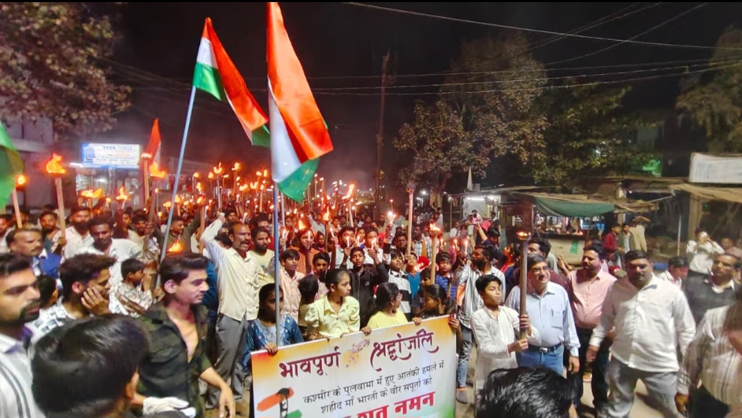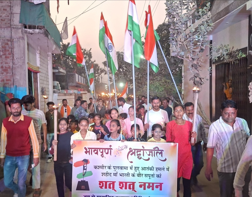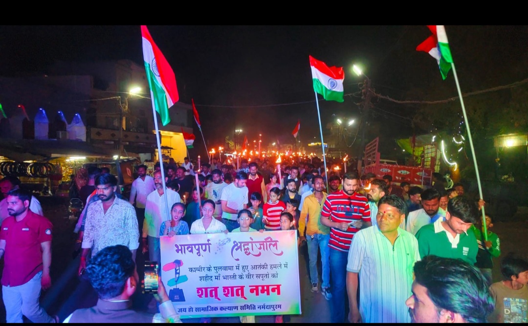 नर्मदापुरम / पुलवामा हमले में शहीद हुए वीर जवानों को श्रद्धांजलि अर्पित करने हेतु नगर की जय हो सामाजिक कल्याण समिति द्वारा भावपूर्ण कैंडल मार्च का आयोजन किया गया। यह कैंडल मार्च आजाद चौक मालाखेड़ी से प्रारंभ होकर विश्वकर्मा मंदिर, छोटा चौराहा होते हुए पुनः आजाद चौक पर समापन हुआ। हाथों में मोमबत्तियां एवं मशाल लिए बड़ी संख्या में उपस्थित नागरिकों, युवाओं एवं सामाजिक कार्यकर्ताओं ने शहीदों के चित्र पर पुष्प अर्पित कर दो मिनट का मौन रखकर श्रद्धांजलि दी। कार्यक्रम के माध्यम से उपस्थितजनों ने शहीदों के सर्वोच्च बलिदान को नमन करते हुए राष्ट्र की एकता एवं अखंडता बनाए रखने का संकल्प लिया। समिति पदाधिकारियों ने कहा कि देश के वीर जवानों का बलिदान सदैव स्मरणीय रहेगा और उनका त्याग हम सभी को राष्ट्रसेवा के लिए प्रेरित करता रहेगा। इस अवसर पर सेना के पूर्व जवान सूबेदार दिनेश सिंह चौहान, हवलदार सुरेन्द्र सिंह, हवलदार दुर्गेश राजपूत, हवालदार सुनील बर्दिया, हवालदार बलवंत, सूबेदार रामेश्वर चौहान, धनपाल तोमर, लोकेश तिवारी, महेश चौकसे, सागर शिवहरे, अभय वर्मा, राजेश अत्रे, रामनरेश सिंह चौहान, अमीन राइन, महेश बावरिया, दौलत राम यादव, बंटी यादव,अजय शर्मा, माखन कीर, गोलू राजपूत, प्रज्वल राजपूत, जीतू कीर, फैजान उल हक, गुलाम मुस्तफा, समिति अध्यक्ष अर्पित मालवीय, समिति के समस्त सदस्यगण जतिन यादव, लोकेश बिश्नोई, विशाल बावरिया, अनुराग वर्मा, कामेश नेमा, अजय बावरिया, सौरभ वर्मा, आकाश माझी, राजेश वर्मा, सौरभ वर्मा, कौशिक बावरिया, सागर पटेल, हर्षित पाल, कमलेश मौर्य, पीयूष गुप्ता, शिवम गोस्वामी, सोमू पटेल, अंकित साहू सहित समस्त देशभक्त उपस्थित रहे।