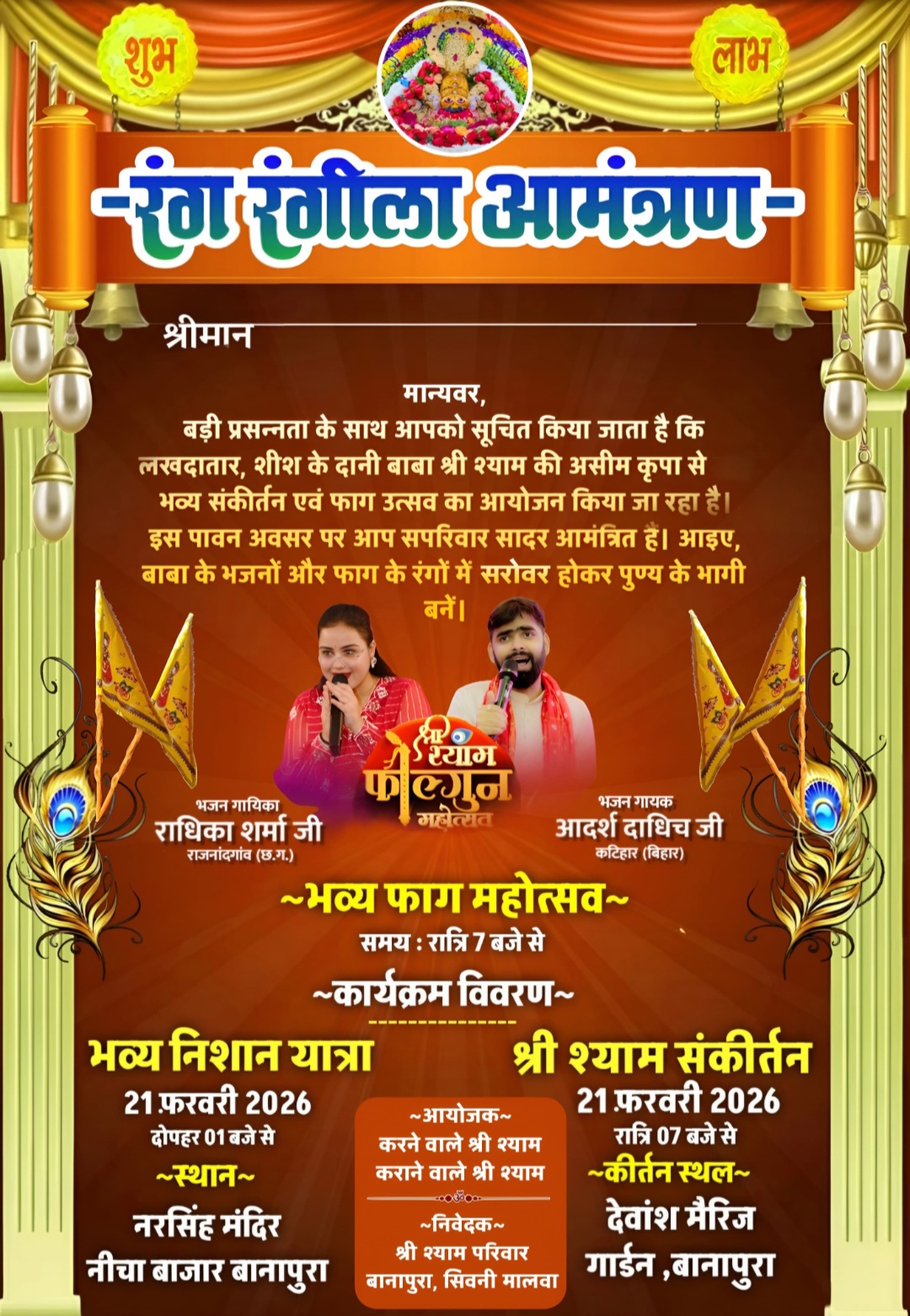 सिवनी मालवा / फागुन माह के पावन अवसर पर 21 फरवरी दिन शनिवार को विशाल निशान यात्रा एवं भव्य श्याम कीर्तन का आयोजन होगा। आयोजन में अलौकिक श्रृंगार अखंड ज्योत इत्र एवं पुष्प वर्षा की जाएगी। भक्ति से ओत प्रोत यह कार्यक्रम क्षेत्र में आकर्षण का केंद्र रहेगा। कार्यक्रम की शुरुआत दोपहर 2:00 बजे श्री नरसिंह मंदिर नीचा बाजार बानापुरा से विशाल निशान यात्रा शुरू की जाएगी। यात्रा नगर के प्रमुख मार्गो से निकलेगी शाम 7:00 बजे से भव्य कीर्तन और भजन संध्या शुरू होगी। भजन संध्या में राजनांदगांव की भजन गायिका राधिका शर्मा और कटिहार के भजन गायक आदर्श दाधिच प्रस्तुति देंगे। वाद्य संगीत लखदातार खुभिकल ग्रुप द्वारा दी जायेगी। साउंड सेवा मोरबी साउंड सिवनी मालवा द्वारा उपलब्ध कराई जाएगी। आयोजन देवांश मैरिज गार्डन बानापुरा में होगा। इसका आयोजन श्याम परिवार बानापुरा सिवनी मालवा द्वारा किया जा रहा है। श्याम परिवार द्वारा श्रद्धालुओं अधिक से अधिक आयोजन में शामिल होने की अपील की गई।