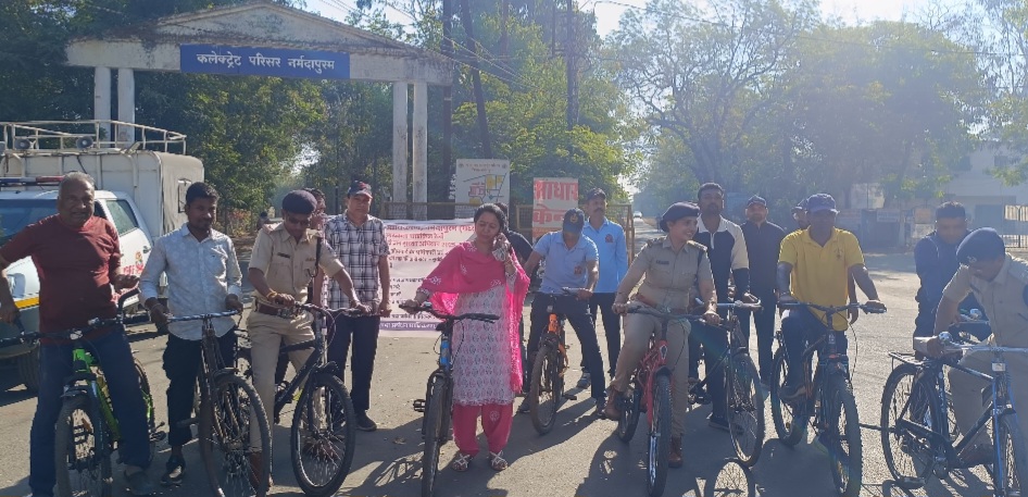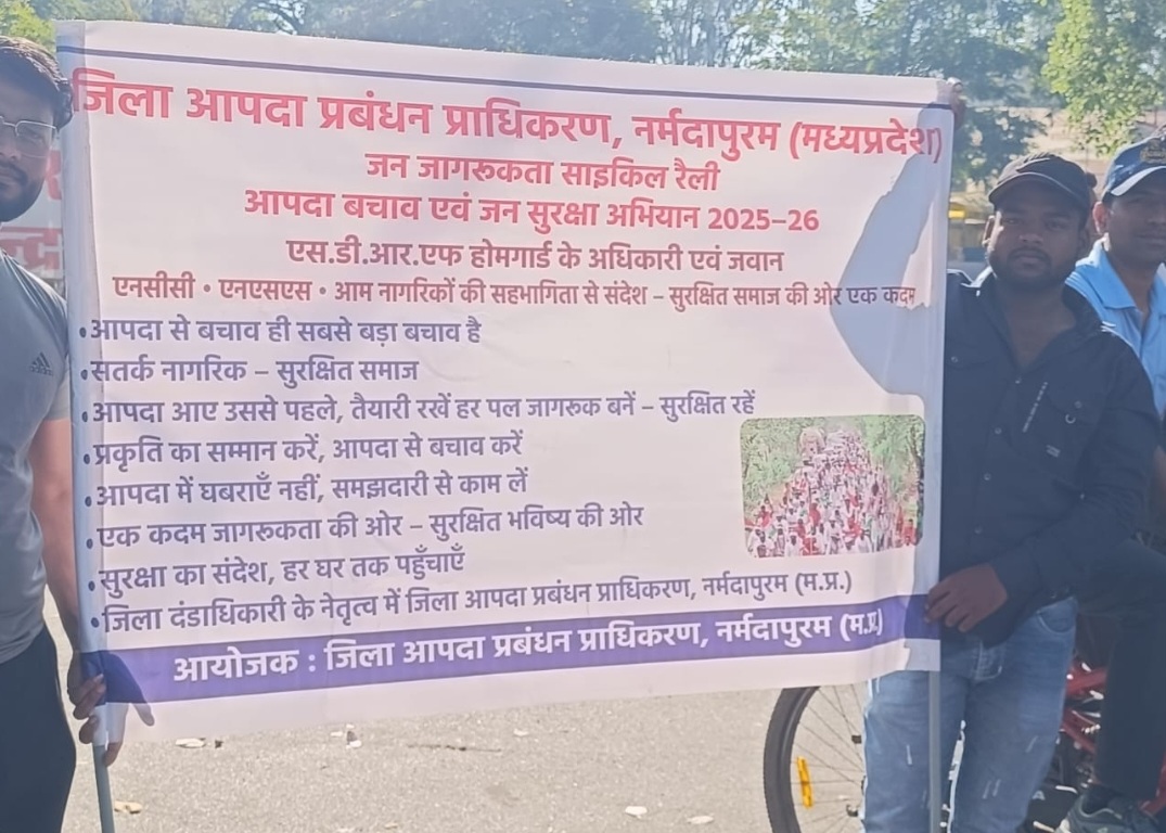 नर्मदापुरम / अमृता शर्मा दिक्षित डिस्ट्रिक्ट कमांडेट के नेतृत्व में एस डी आर एफ, सिविल डिफेंस, होमगार्ड द्वारा कलेक्ट्रेट गेट से “आपदा बचाव एवं जनसुरक्षा जागरुकता अभियान 2025-26 के तहत् जन जागरुकता साईकिल रैली का डिप्टी कलेक्टर बबिता राठोर द्वारा फ्लेग दिखाकर रवाना किया। एन सी सी, एन एस एस आम नागरिकों की सहभागिता से सुरक्षित समाज के संदेश देने के लिए एस डी आर एफ,सिविल डिफेंस, होमगार्ड के जवानों के साथ पत्रकार विलास नीले ने जनसामान्य का प्रतिनिधित्व किया। इस अवसर पर शिवराज चौधरी, प्लाटून कमांडर, सुन्दर लाल मरावी एस आई की उपस्थिति में जिला दंडाधिकारी के नेतृत्व में आपदा प्रबंधन, प्राकृतिक घटनाओं के समय बचाव के उपाय और सुरक्षित रहने के लिए जागरुकता अभियान चलाया जा रहा है। साईकिल रैली शहर के मुख्य मार्ग से प्रातः 8 बजे रवाना हुई।