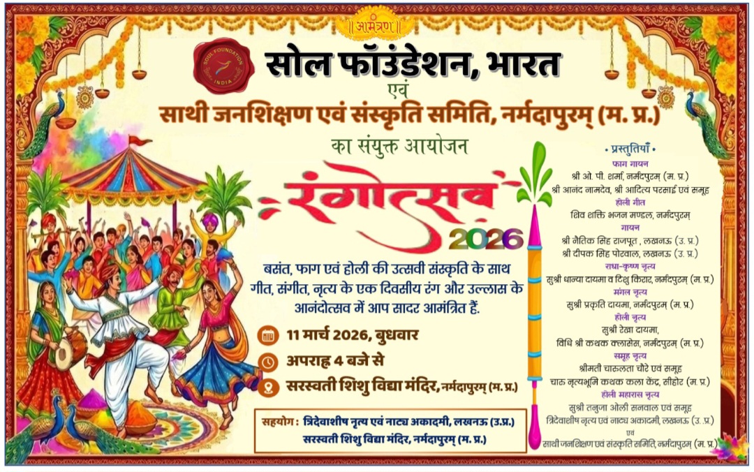 नर्मदापुरम / कल रंगोत्सव का आयोजन किया जाएगा। फाग, बसंत एवं होली की उत्सवी संस्कृति के साथ गीत, संगीत एवं नृत्य से सजे इस रंग और उल्लास के इस उत्सव का आयोजन सोल फाउंडेशन भारत एवं साथी जनशिक्षण एवं संस्कृति समिति नर्मदापुरम के संयुक्त तत्वाधान में किया जा रहा है। सरस्वती शिशु विद्या मंदिर उच्चतर माध्यमिक विद्यालय नर्मदापुरम के सहयोग से किए जा रहे इस रंगोत्सव में नैतिक सिंह राजपूत, दीपक सिंह पोरवाल लखनऊ का गायन होगा। ओ. पी. शर्मा, आनंद नामदेव, आदित्य परसाई एवं समूह का फाग गायन, शिव शक्ति भजन मंडल की होरी लोकगीत, धन्या दायमा और टिशु किरार का राधा कृष्ण नृत्य, प्रकृति दायमा का मंगल गाओ नृत्य, रेखा दायमा द्वारा होली नृत्य होगा। चारु नृत्यभूमि कथक कला केंद्र, सीहोर से श्रीमती चारूलता चौरे एवं समूह द्वारा फागुन रासरंग नृत्य की प्रस्तुति दी जाएगी एवं त्रिदेवाशीष नृत्य एवं नाट्य अकादमी लखनऊ की सुश्री तनुजा ओली सनवाल एवं समूह होली महारास नृत्य प्रस्तुत करेंगे। राधा कृष्ण भजन मंडल उमरखेड़ी के नवल सिंग पटेल एवं समूह फाग लोकगीत की प्रस्तुति देंगे। इस रंगोत्सव को प्रारंभ करने का प्रमुख उद्देश्य बसंत, फाग एवं होली की उत्सवी संस्कृति को संजोना एवं लोगों से परिचय के साथ साथ इसे सुरक्षित रखना है। सभी के सहयोग से ही इस आयोजन को सम्पन्न किया जाएगा। रत्नेश साहू, संजय श्रोतिय, हितेश मेहरा,अनिल राठौर, चैन सिंह मीना, प्रेम शंकर मांगरोल, मुकेश मालवीय, विमल सिंह राजपूत, मुवीन, असमादित्य तिवारी, अभिषेक अहिरवार, मनोज परसाई, मंगलेश सिंगारिया, आकाश शिवहरे, नितिन रोहर, अजीत सिंह राठौर, नर्मदा प्रसाद हरयाले आदि संयोजन समिति के कार्य को करेंगे।