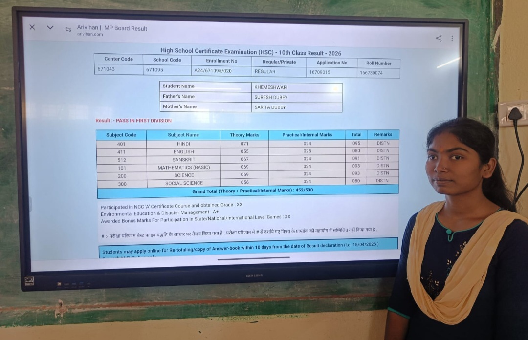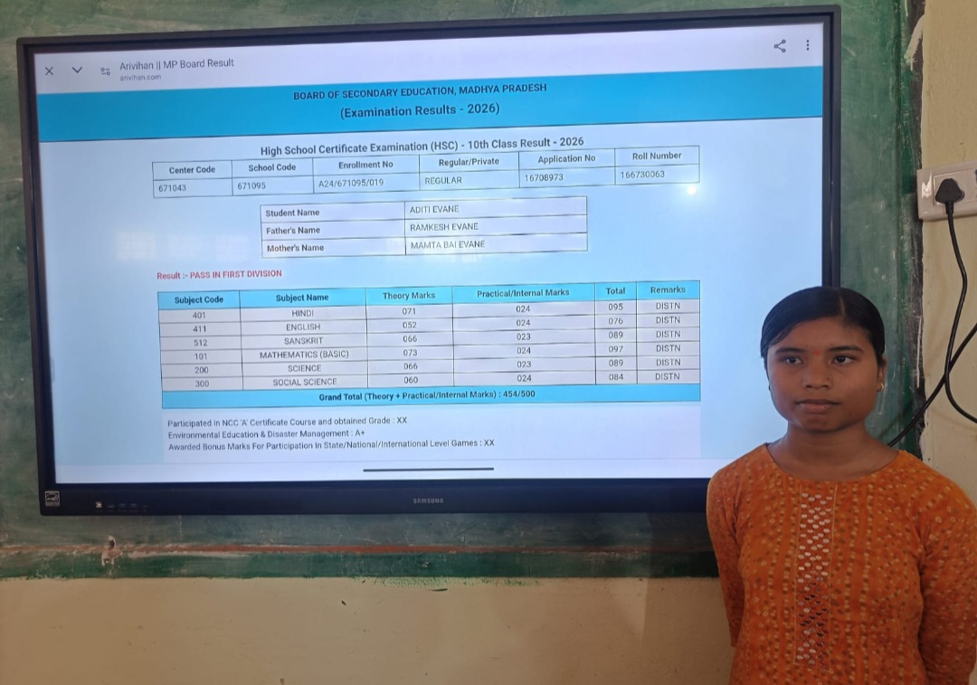 सिवनी मालवा / मध्य प्रदेश माध्यमिक शिक्षा मंडल द्वारा घोषित हुए हाई स्कूल एवं हायर सेकेंडरी स्कूल परीक्षा परिणाम वर्ष 2026 में शासकीय उच्चतर माध्यमिक विद्यालय सोमलवाड़ा की छात्राओं ने उत्कृष्ट प्रदर्शन करते हुए विद्यालय का नाम गोर्बान्वित किया है। विद्यालय की छात्रा कुमारी अदिति इवने एवं कुमारी खेमेश्वरी दुबे ने कक्षा दसवीं में शानदार अंक प्राप्त कर टॉप स्थान हासिल किया है। प्राप्त जानकारी के अनुसार कुमारी अदिति पिता रामकेश इवने ने कुल 500 अंक में से 454 अंक प्राप्त कर प्रथम श्रेणी में परीक्षा उत्तीर्ण की है। अदिति ने हिंदी में 95, अंग्रेजी में 76, संस्कृत में 89, गणित बेसिक में 97, विज्ञान में 89 एवं सामाजिक विज्ञान में 84 अंक प्राप्त किए हैं। सभी विषयों में विशेष योग्यता प्राप्त की है, जो उनकी निरंतर मेहनत और लगन को दर्शाता है। इसी प्रकार कुमारी खेमेश्वरी दुबे पिता सुरेश दुबे ने भी उत्कृष्ट प्रदर्शन करते हुए 500 में से 452 अंक अर्जित किए और प्रथम श्रेणी में सफलता हासिल की है। कुमारी खेमेश्वरी दुबे ने हिंदी में 95, अंग्रेजी में 80, संस्कृत में 91, गणित बेसिक में 93, विज्ञान में 93 तथा सामाजिक विज्ञान में 80 अंक प्राप्त किए हैं। उन्हें भी सभी विषयों में विशेष योग्यता प्राप्त की है, जो उनकी प्रतिभा और अनुशासन का परिचायक है।संस्था के प्राचार्य राममोहन रघुवंशी एवं सभी शिक्षकों ने छात्राओं को बधाई दी है शासकीय उच्चतर माध्यमिक विद्यालय सोमलवाडा का हाई स्कूल परीक्षा परिणाम 100% रहा वर्ष 2024- 25 में 95% था इसी प्रकार कक्षा 12वीं हाई सेकेंडरी का परीक्षा परिणाम 92% रहा वर्ष 2024- 25 में परीक्षा परिणाम 77% रहा था इस वर्ष परीक्षा परिणाम में वृद्धि हुई है