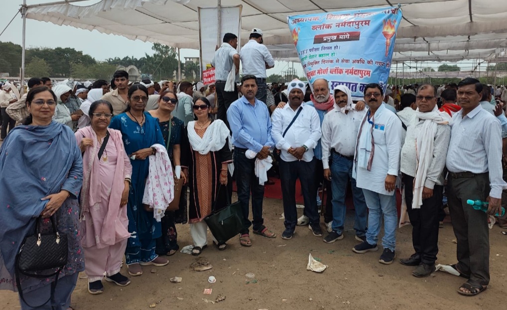 नर्मदापुरम / शनिवार 18 अप्रैल 2026 को अध्यापक शिक्षक संयुक्त मोर्चा के तत्वाधान में भेल दशहरा मैदान भोपाल में मध्य प्रदेश के लाखों शिक्षकों ने टीईटी परीक्षा के विरोध में एवं नियुक्ति दिनांक से वरिष्ठता के संबंध में एक दिवसीय धरना प्रदर्शन किया । प्रदेश के कोने कोने से लाखों शिक्षकों ने भोपाल में उपस्थित होकर धरने को सफल बनाया। इसी कड़ी में ब्लॉक नर्मदापुरम से के एस वाडिवा के मार्गदर्शन में सैकड़ों शिक्षकों ने भोपाल पहुंचकर इस धरना प्रदर्शन कार्यक्रम में अपनी सहभागिता दी।आज भोपाल में धरने में सहभागिता देने वाले में रामकृष्ण पुरोहित, परम सुख गढ़वाल, गौरी शंकर राजपूत, सुनील उइके, संजीव द्विवेदी, कमलेश टेकाम, पुरुषोत्तम अहिरवार, देवेंद्र खरे, विद्या ठाकुर, ज्योति सूर्यवंशी, सुमित तिवारी, शिव प्रसाद ओंनकार, गजेंद्र यादव, मंगली प्रसाद बढ़कर, बाबूलाल तोमर, अनिरुद्ध तिवारी, संतोष गौर, संतोष परते, लाजरूस तिग्गा, मोहिनी राजपूत, अनंता चौबे, विजय युवने, कुंती युवने, रमेश गोखले, अजय बाजपेई, प्रमिला चौधरी, सरला उईके, अनिरुद्ध तिवारी, नंदकिशोर चौधरी, ओमप्रकाश शर्मा, बारेकल कटारे, मोनिका जोशी, माया मालवीय, सेल्वी पवार, चंद्रकिरण पवार, मनीष सोनी, संजय लोनारे, सुनील गौर, शशि गौर, सुरेंद्र गौर, छाया पटेल, विनीता साहू, निशा शर्मा, निशा सरयाम सहित अन्य सैकड़ों शिक्षक इस कार्यक्रम में उपस्थित हुए। संयुक्त मोर्चा द्वारा निर्णय लिया गया कि यदि सरकार ने टीईटी परीक्षा निरस्त नहीं करवाई और नियुक्ति दिनांक से वरिष्ठता नहीं दी तो 16 जून 2026 से प्रदेश के समस्त स्कूलों को बंद कर तालाबंदी की जाएगी।