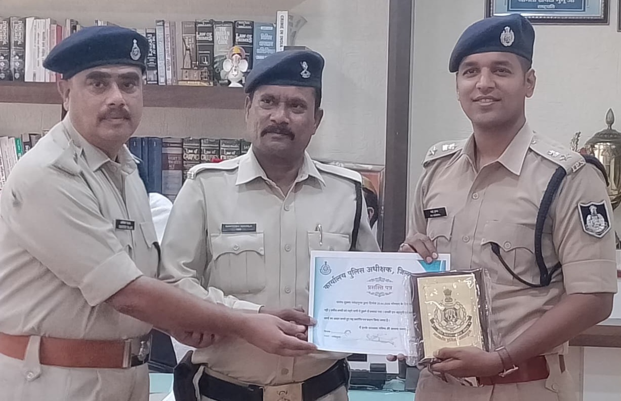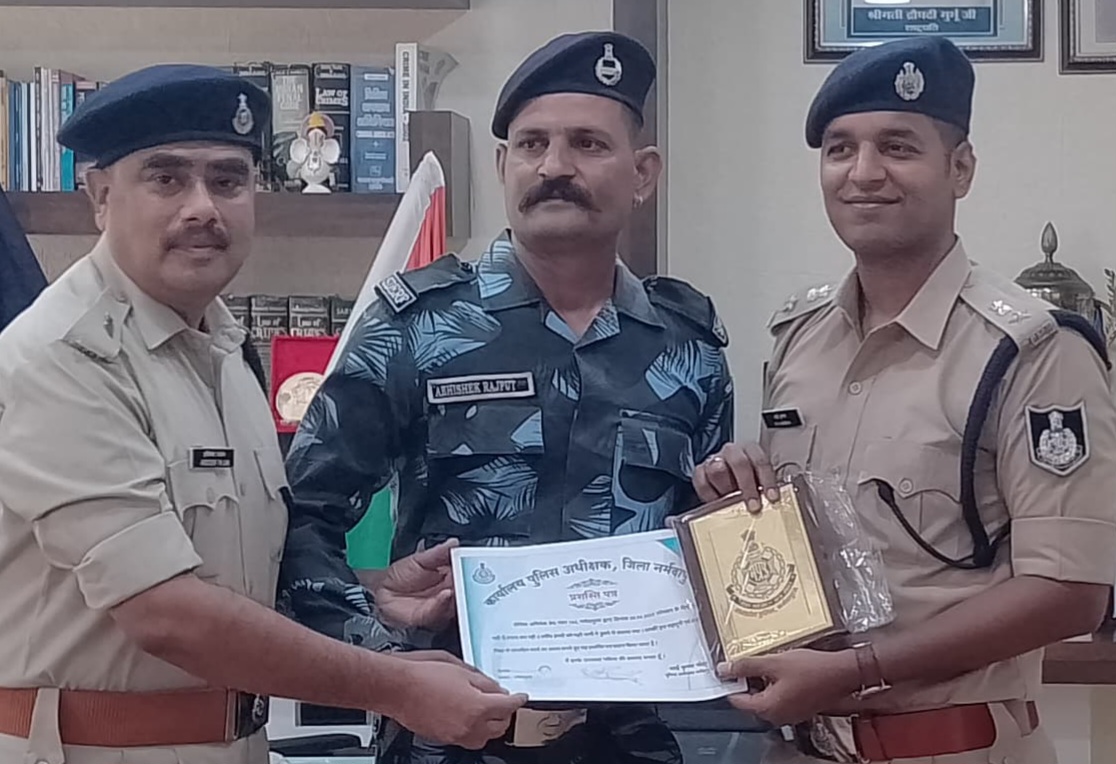 पुलिस अधीक्षक साई कृष्णा द्वारा पुलिस अधीक्षक कार्यालय नर्मदापुरम में SDERF सैनिक अभिषेक राजपूत और सैनिक संतोष शुक्ला को उनकी कर्तव्यनिष्ठा और बहादुरी के लिए सम्मानित किया एवं भविष्य में भी इसी जज्बे के साथ ड्यूटी करने हेतु शुभकामनाएं दी। इस अवसर पर अतिरिक्त पुलिस अधीक्षक अभिषेक राजन सहित जिला विशेष शाखा प्रभारी निरीक्षक शंकर सिंह मुजाल्दे भी उपस्थित रहे।