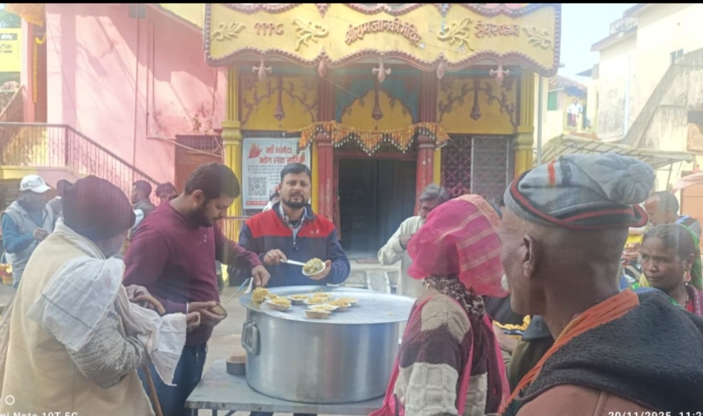 नर्मदापुरम / मार्ग शीर्ष माह की कृष्ण पक्ष की अमावस्या की तिथि भगवान विष्णु शनिदेव एवं पितरों के आराधना के लिए विशेष तिथि मानी गई है। इस दिन पितरों के निमित्त तिल के तेल का दिया जलाना अत्यंत शुभ एवं फलदाई बताया गया है। इसी उपलक्ष्य में मां नर्मदा भोग सेवा समिति ने स्थानीय सेठानी घाट स्थित श्री राम जानकी मंदिर पर नर्मदा स्नान करने आए श्रद्धालुओं को खिचड़ी प्रसादी का वितरण किया। इस कार्यक्रम में समिति के संरक्षक हंस राय अध्यक्ष विवेक चौकसे, पं. लवलेश शर्मा, राजेश खत्री, चिंटू राठौर, आयुष दुबे, प्रकाश गुप्ता, योगेश राठौर, रितेश शर्मा, साजन हेमनानी, डॉ. शुभम दुबे, श्यामु नायक, विनय यादव, मधुर शिवहरे, अनिल गोस्वामी, सौरभ पटवा, दीपक ठाकुर, सौरभ तिवारी, राजा कहार, जय सिंह यादव, हितेश मनवरे, दीपक साहू, भुवनेश मेश्कर, गौरव पटवा, सुमित पटेल आदि सहयोगी उपस्थित रहे। यह कार्यक्रम प्रत्येक पूर्णिमा एवं अमावस्या पर एवं विशेष पर्वों पर निरंतर चार वर्षो से किया जा रहा है।
