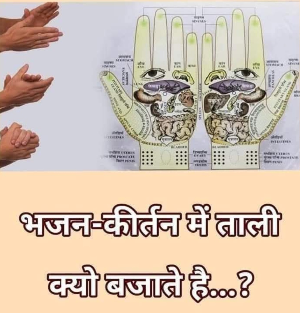 प्राचीन काल से मंदिरों में पूजा, आरती, भजन-कीर्तन आदि में समवेतु रूप से ताली बजाने की परंपरा रही है, जो हमारे शरीर को स्वस्थ रखने का एक अत्यंत उत्कृष्ट साधन है। चिकित्सकों का कहना है कि हमारे हाथों में एक्यूप्रेशर प्वाइंट्स अधिक होते हैं। ताली बजाने के दौरान हथेलियों के एक्यूप्रेशर केंद्रों पर अच्छा दबाव पड़ता है। जिससे शरीर की अनेक बीमारियों में लाभ पहुंचता है और शरीर निरोगी बनता है, अतः ताली बजाना एक उत्कृष्ट व्यायाम है। इससे शरीर की निष्क्रियता खत्म होकर क्रियाशीलता बढ़ती है। रक्त संचार की रुकावट दूर होकर अंग ठीक तरह से कार्य करने लगते हैं। रक्त का शुद्धिकरण बढ़ जाता है और हृदय रोग, रक्त नलिकाओं में रक्त का थक्का बनना रुकता है। फेफड़ों की बीमारियां दूर होती हैं। रक्त के श्वेत रक्तकण सक्षम तथा सशक्त बनने के कारण शरीर में चुस्ती, फुर्ती तथा ताजगी का एहसास होता है। रक्त में लाल रक्तकणों की कमी दूर होकर वृद्धि होती है और स्वास्थ्य सुधरता है। अतः पूजा-कीर्तन में तालबद्ध तरीके से अपनी पूरी शक्ति से ताली बजाएं और रोगों को दूर भगाएं। इससे तन्मय होने और ध्यान लगाने में भी सुविधा होगी।