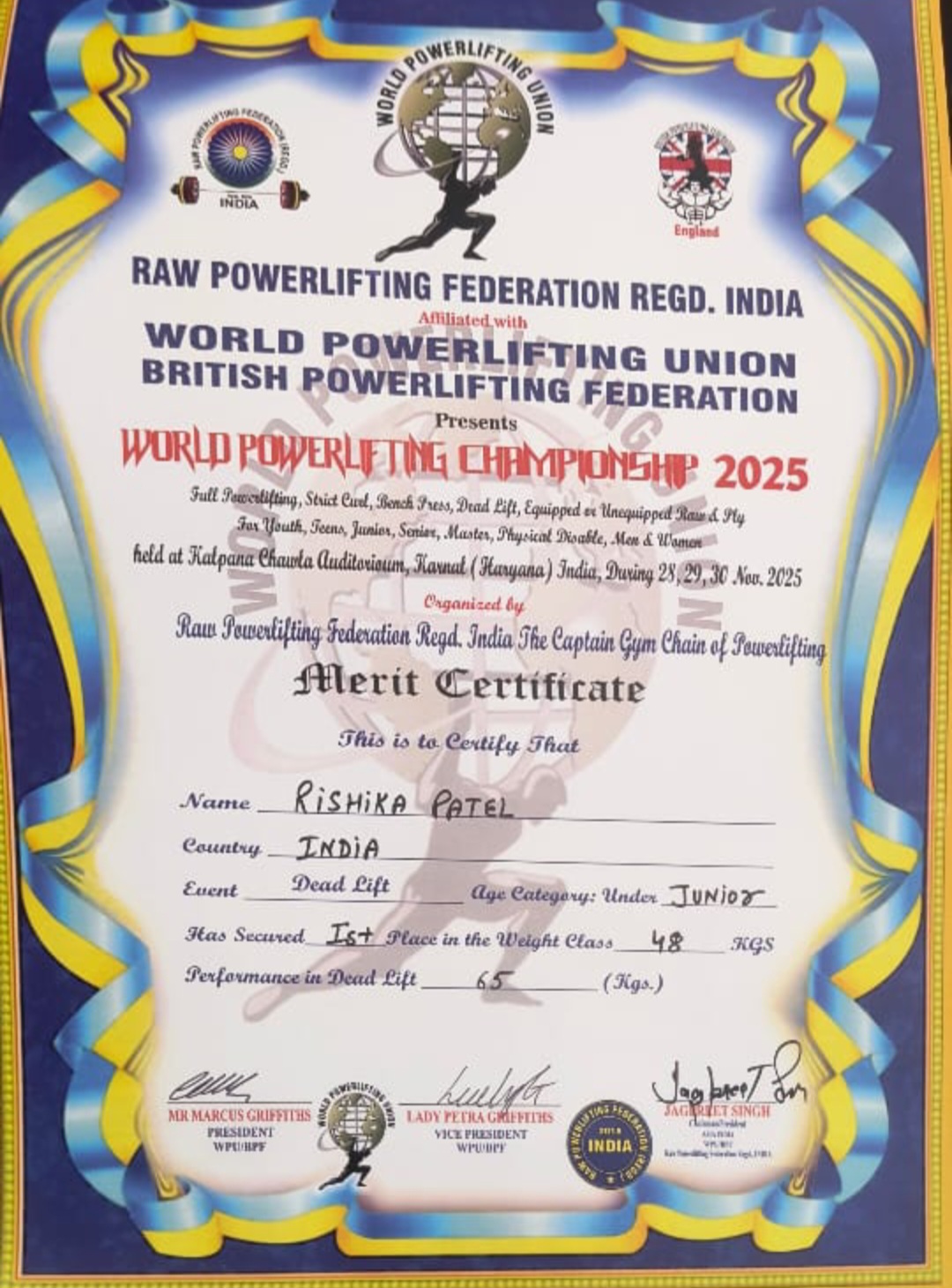 इटारसी / हरियाणा करनाल के कल्पना चावला ऑडिटोरियम में 28 से 30 नवंबर तक आयोजित वर्ल्ड पावरलिफ्टिंग चैंपियनशिप 2025 में इटारसी की खिलाड़ी ऋषिका पटेल ने गोल्ड मेडल जीतकर भारत और मध्यप्रदेश का नाम रोशन किया। तीन दिवसीय अंतरराष्ट्रीय प्रतियोगिता का आयोजन रॉ पावरलिफ्टिंग फेडरेशन रजिस्टर्ड इंडिया, वर्ल्ड पावरलिफ्टिंग यूनियन और ब्रिटिश पावरलिफ्टिंग फेडरेशन ने संयुक्त रूप से किया। इसमें भारत, इंग्लैंड, ब्रिटेन सहित कई देशों के खिलाड़ी शामिल हुए।