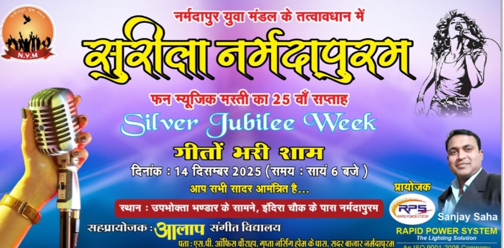 नर्मदापुरम / नर्मदापुर युवा मंडल का सुरीला नर्मदापुरम संगीत कार्यक्रम का कल 25 हफ्तों का सफल सफर पूरा हो रहा है। आज शाम 6 बजे उपभोक्ता भंडार के सामने सिल्वर जुबली समारोह के रूप में खास जश्न मनाया जाएगा। यह कार्यक्रम फन, मस्ती और म्यूजिक की शानदार प्रस्तुति के साथ मनाया जाएगा। नर्मदापुर युवा मंडल के अध्यक्ष अखिलेश खंडेलवाल ने बताया कि संगीत का यह कार्यक्रम पिछले 24 हफ्तों से प्रत्येक रविवार को नेहरू पार्क में पारिवारिक और सांस्कृतिक माहौल में आयोजित किया जा रहा है। युवा मंडल के मनीष परदेशी ने बताया कि सिल्वर जुबली कार्यक्रम में लाइव ऑर्केस्ट्रा, कराओके प्रस्तुति, एकल एवं युगल गीत, मिमिक्री आर्टिस्ट, और स्थानीय कवियों की रचनाओं का विशेष पाठ आकर्षण होंगे। सुरीला नर्मदापुरम का सिल्वर जुबली कार्यक्रम में 35 से अधिक संगीत कलाकारों द्वारा प्रस्तुति दी जाएगी। कल रविवार को शहरवासियों के लिए एक यादगार सुरीली शाम के रूप में रहेगी।
