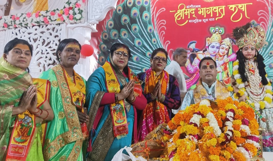 नर्मदापुरम / विश्व हिंदू परिषद मातृशक्ति ने इटारसी से गीता मैरिज पैलेस भवन नर्मदापुरम पहुंचकर महर्षि याज्ञवल्क्य सनातन कल्याण समिति के तत्वावधान में आयोजित संगीतमय श्रीमद्भागवत कथा में व्यास पीठ में विराजमान कथावाचक आचार्य पंडित अविनाश मिश्रा महाराज का स्वागत सम्मान कर भक्तिमय वातावरण का आनंद लिया और वृंदावन से पधारे विद्वान पुरोहितों के द्वारा सर्व पितृ मोक्षार्थ सामूहिक मूलपाठ भी किया गया। उक्त दिव्य आयोजन के शुभ अवसर पर विश्व हिंदू परिषद मातृशक्ति नर्मदापुरम जिला संयोजिका श्रीमती तरुणा सोनी, इटारसी नगर सत्संग प्रमुख अर्चना सातपुते, सेवा प्रमुख चंद्रकला नागवंशी एवं कार्यकारणी सदस्य उषा मालवीय व्यासपीठ का पूजन करने पहुंची।