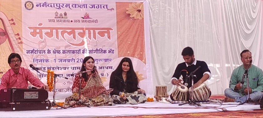 नर्मदापुरम / नव वर्ष 2026 के भक्तिमय स्वागत हेतु नर्मदापुरम् कला जगत द्वारा जय जगन्नाथ•जय जगदानंदी “मंगलगान” कार्यक्रम अखंड मंडलेश्वर धाम, नर्मदा आश्रम, डोंगरवाड़ा, नर्मदापुरम् में दिनांक 1 जनवरी 2026 गुरुवार को आयोजित किया गया। भक्तिरस से सजे कार्यक्रम में नर्मदांचल के श्रेष्ठ कलाकारों क्रमशः शिवांगी दुबे ओझा, डॉ. दीक्षा दुबे, वैशाली शर्मा मिश्रा, कमल झा, रितु कुलश्रेष्ठ, श्रीराम परसाई, डॉ. नमन तिवारी ने अपनी प्रस्तुति दी। तबला संगत आनंद नामदेव और सक्षम पाठक ने की। सभी कलाकारों का स्वागत बाबाजी प्रसाद दास ने किया। कार्यक्रम में पूर्व विधायक पंडित गिरिजा शंकर शर्मा, तबलावादक रामसेवक शर्मा, वरिष्ठ कवि प्रदीप दुबे दीप, कर सलाहकार प्रणव देशवाल, शिवमंगल चौहान सहित सैकड़ों की संख्या में श्रद्धालु श्रोता उपस्थित रहे। अंत में विजय पालीवाल ने आभार व्यक्त किया। नर्मदा आश्रम के कर्ताधर्ता बाबाजी प्रसाद दास ने बताया कि इस वर्ष से मंगलगान कार्यक्रम प्रतिवर्ष एक जनवरी को आयोजित किया जायेगा।